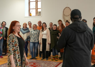 Her føler vi os ind i musikken sammen, synger fra hjertet, slipper hjernen og kontrollen, og oplever magien i at skabe kunst sammen – på tværs af stemmer og erfaringer. Ofte opstår der øjeblikke af ren væren i sangen, hvor alt løfter sig. Det gør der fordi vi overgiver os til nuet med stemmen, til fælleslyden og lader musikken, intentionen og hinanden guide og inspirere os. Det er her, vi mærker den særlige kraft og det smukke og helt unikke, der opstår, når vi synger og skaber sammen